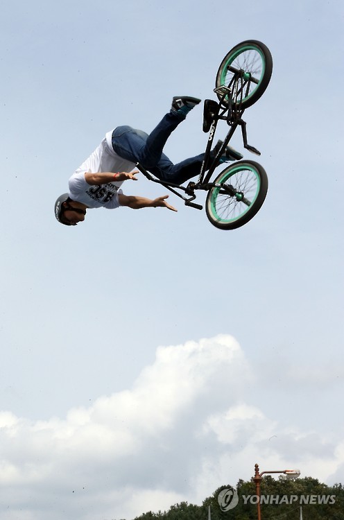| △ 춘천레저대회 멋진 기술 (춘천=연합뉴스) 이상학 기자 = 9일 강원 춘천시 송암레포츠타운에서 '2015 춘천레저대회'가 열려 액션스포츠 종목에 출전한 선수가 화려한 기술을 선보이고 있다. 2015.8.9 hak@yna.co.kr |