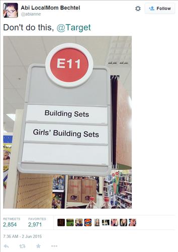 두 달 전 애비 베첼은 타깃 매장을 갔다가 완구 코너에서 '완구류'와 '소녀용 완구류'라는 표시가 같이 붙어 있자 트위터에 사진과 함께 "타깃은 이렇게 해서는 안 된다"는 글을 올려 시선을 끌었다.