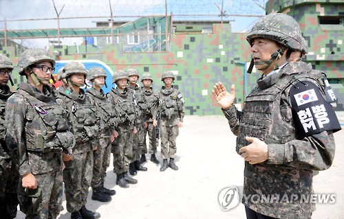 | △ 비무장지대 소초 찾은 한민구 국방장관 (서울=연합뉴스) 한민구 국방부 장관이 10일 북한군이 매설한 목함지뢰 폭발 사고가 발생한 비무장지대(DMZ) 소초(GP)를 방문해 장병들을 격려하고 있다. 한 장관은 이날 "적의 도발에 응당하는 혹독한 대가를 치르게 할 것"이라며 "적이 도발해오면 GP장 판단 하에 주저함 없이 자신감을 갖고 과감하고 단호하게 대응해달라"고 지시했다. (국방부 제공) |