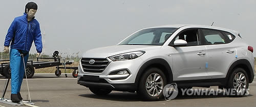 | △ 지난 5월 14일 오전 경기 화성시 교통안전공단 자동차안전연구원에서 열린 '첨단안전장치 및 자율주행차 기술시연회'에서 보행자를 인지한 첨단안전자동차가 자동으로 긴급 제동하고 있다. (연합뉴스 자료사진) |