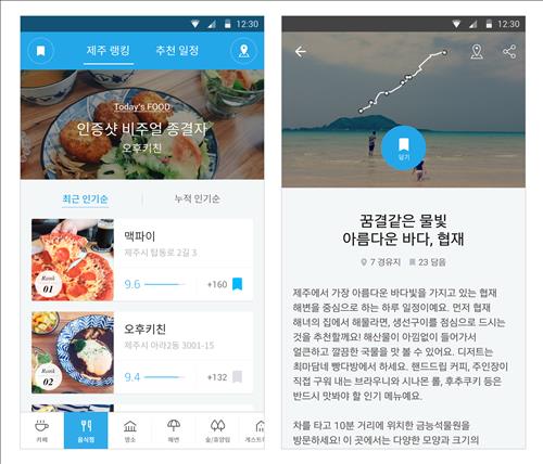 메인 화면의 순위 메뉴는 카테고리별 화제의 여행 정보를 인기 순으로 나열해 위치, 전화번호, 이용자 평점 등을 소개한다. '추천 일정' 메뉴에서는 인기 여행지를 주제별로 구성해 추천하는 큐레이션 서비스도 제공한다.