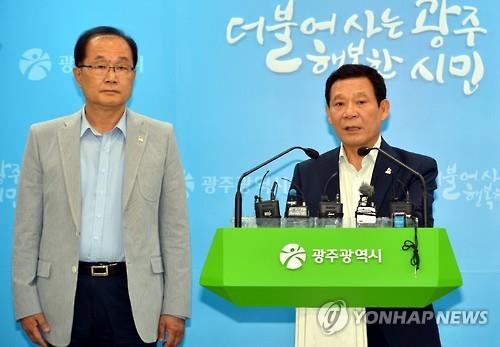 | △ (광주=연합뉴스) 여운창 기자 = 광주U대회 조직위원회 윤장현 시장과 김윤석 사무총장은 22일 광주시청 브리핑룸에서 긴급 기자회견을 하고 지난 19일 오후 6시31분에 조직위 이메일 계정으로 북한이 대회 참가가 어렵다는 뜻을 밝혔다고 말했다. 2015.6.22 <<광주시>> betty@yna.co.kr |