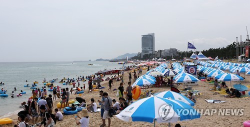 | △ 강릉 경포해수욕장 찾은 피서객 (강릉=연합뉴스) 유형재 기자 = 9일 강원 강릉시 경포해수욕장을 찾은 피서객들이 해수욕을 즐기거나 파라솔 아래서 무더위를 식히고 있다. 2015.8.9 yoo21@yna.co.kr |