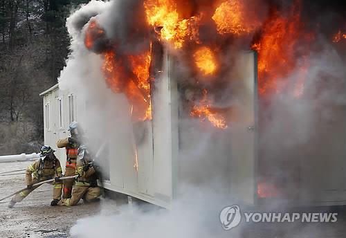 | △ (서울=연합뉴스) 이지은 기자 = 은평소방대원들이 서울 은평구 진관동 소방행정타운 부지에 설치된 샌드위치 패널 가건물에서 효율적인 화재진압 방법을 알아보기 위해 화재 재연 실험을 하고 있다. 이날 실험은 서울소방재난본부 주관으로 열렸다. 2014.12.22 jieunlee@yna.co.kr (끝) |