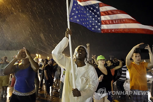 | △ 퍼거슨 사태 1년, 빗속 시위 (퍼거슨<美미주리> AP=연합뉴스) '퍼거슨 사태' 1주년인 9일(현지시각) 미국 미주리 주 퍼거슨 시에서 주민들이 비를 맞으며 거리 행진을 하고 있다. 1년 전 흑인 청년 마이클 브라운이 백인 경찰관 대런 윌슨의 총에 맞아 숨졌다. ciy@yna.co.kr |