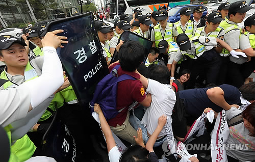 | △ 서울중앙지검 공안2부(김신 부장검사)는 '국정원 규탄' 불법 집회를 주최한 혐의(집회 및 시위에 관한 법률 위반)로 21세기한국대학생연합(한대련) 전 의장 김모(26·여)씨를 불구속 기소했다고 11일 밝혔다. 사진은 지난 2013년 6월 당시 '국정원 규탄' 불법 집회 모습. (연합뉴스 자료사진) |