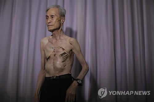 | △ 1945년 8월 9일 나가사키에 원자폭탄이 투하됐을 피폭 후 생존한 다니구치 스미테루(86) 씨가 원폭 피해의 심각성을 알리기 위해 자신의 몸을 보여주고 있다. 나가사키 원폭 생존자위원회 회장인 그는 원폭으로 인해 등 거의 전체에 상처가 났다. 반쯤 썩어 떨어져나간 갈비뼈 3개가 폐를 압박하면서 평생 숨쉬기조차 힘들어졌다고 한다. 2015년 6월 30일 촬영(AP=연합뉴스 자료사진) |