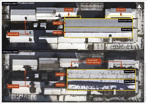 IHS 제인는 원심분리기 건물 지붕과 주변부에 쌓인 눈이 어떻게 변하는지를 토대로 가동 여부를 판단했다.