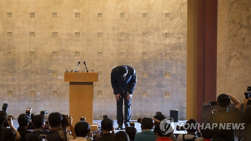 | △ 사과 인사하는 신동빈 회장 (서울=연합뉴스) 윤동진 기자 = 롯데그룹 신동빈 회장이 11일 오전 서울 중구 롯데호텔에서 최근 불거진 경영권 분쟁과 관련해 대국민 사과를 하고 있다. |