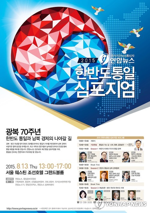 (서울=연합뉴스) 이상현 기자 = 국가기간뉴스통신사인 연합뉴스가 광복 70주년을 맞아 대통령 직속 통일준비위원회와 공동으로 주최하는 '2015 한반도통일 심포지엄'이 13일 열린다.