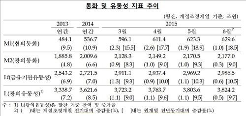 한국은행이 12일 발표한 '6월 중 통화 및 유동성' 통계를 보면 6월 시중 통화량(M2·광의통화)은 2천180조원(평잔·원계열 기준)으로 작년 같은 달보다 9.0% 늘었다.