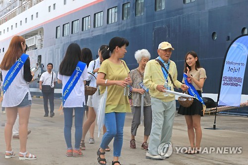 | △ (제주=연합뉴스) 박지호 기자 = 12일 오전 제주항에 도착한 일본의 크루즈 여객선 니폰마루의 승객들이 제주 관광을 위해 하선하고 있다. 2015.8.12 jihopark@yna.co.kr |