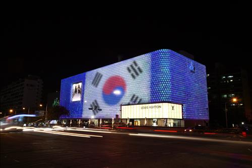 서울 압구정동 갤러리아 명품관도 15일까지 서관 외벽에 설치된 4천330개의 유리디스크 LED를 통해 '휘날리는 태극기' 영상을 내보낸다.