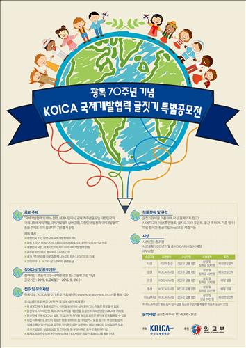 (서울=연합뉴스) 신유리 기자 = 정부 무상원조 전담 기관인 한국국제협력단(코이카)은 광복 70년을 맞아 청소년을 대상으로 '코이카 국제 개발협력 글짓기 특별 공모전'을 연다고 12일 밝혔다.