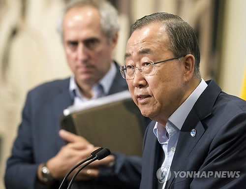 | △ 중아공 유엔평화유지군 '성폭행'…단장 사임 (유엔본부 AP/유엔=연합뉴스) 반기문 유엔 사무총장(오른쪽)은 12일(현지시간) 중아공에 파견된 유엔평화유지군이 민간인 부자를 살해하고 10대 소녀를 성폭행했다는 주장이 제기된 것과 관련 세네갈 출신의 평화유지군 단장 바바카 가예가 제출한 사직서를 수리했다고 기자들에게 밝혔다. |