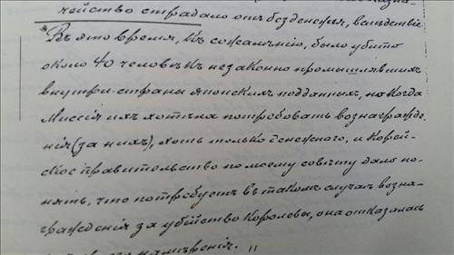 동북아역사재단 김영수 연구위원은 카를 베베르 러시아 특명전권공사의 '1898년 전후 한국에 대한 보고서'를 분석한 결과 고종이 주한일본공사관에 을미사변의 책임자 처벌과 함께 손해배상을 요구한 것으로 드러났다고 13일 밝혔다.
