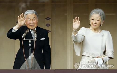 | △ (교도=연합뉴스) 아키히토(明仁) 일왕 부부가 2015년 1월 2일 오전 일본 도쿄 황거(皇居)에서 일반인을 상대로 한 신년 축하 행사에서 손을 흔들고 있다. |