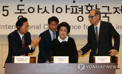 | △ 2015 동아시아평화국제회의 (서울=연합뉴스) 한종찬 기자 = 13일 오전 서울 대한상공회의소에서 열린 '2015 동아시아평화국제회의'에서 이희호 김대중 평화센터 이사장(가운데)이 인사하고 있다.왼쪽은 하토야마 유키오 전 일본 총리, 오른쪽은 동아시아평화 국제회의 대표인 이홍구 전 총리. |