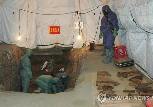 | △ 2004년 9월 22일 중국 헤이룽장(黑龍江)성 무단장(牡丹江·모란강)시에서 중국과 일본의 합동 팀이 옛 일본군이 버리고 한 화학무기 발굴 작업을 하는 장면. (교도=연합뉴스 자료사진) |