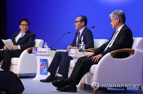 | △ '분단 70년과 한반도 미래' 패널토론 (서울=연합뉴스) 김주성 기자 = 광복 70주년을 맞아 13일 오후 서울 중구 웨스틴조선호텔에서 열린 '2015 한반도통일 심포지엄'에서 박진 전 국회 외교통상통일위원장(왼쪽부터), 최진욱 통일연구원장, 윤덕민 국립외교원장이 '분단 70년과 한반도 미래'라는 주제로 패널 토론을 하고 있다. utzza@yna.co.kr |