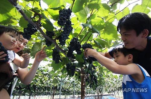 | △ 옥천포도 수확 체험하는 관광객들 <<연합뉴스 DB>> |