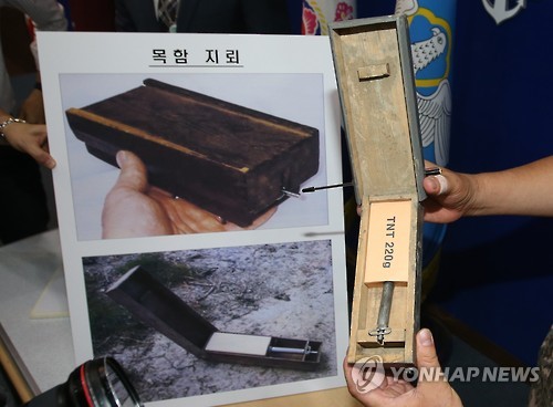 | △ 북한이 DMZ에 매설한 목함지뢰 (서울=연합뉴스) 임헌정 기자 = 10일 서울 용산 국방부에서 군 관계자가 북한이 비무장지대(DMZ)에 매설한 살상용 목함지뢰에 대해 설명하고 있다. 군 당국은 성명을 통해 강력한 보복응징 의지를 천명하면서 북한에 대해 사과와 책임자 처벌을 촉구했다. 2015.8.10 kane@yna.co.kr |