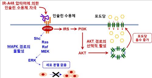 또 인슐린 수용체에 있는 7개의 아미노산(티로신)을 모두 활성화하는 인슐린과는 달리 단 한 개(Y1150)만 활성화해 혈당을 낮추는 기능을 유지하면서 세포를 증식시키는 부작용은 일으키지 않는 것으로 확인됐다.