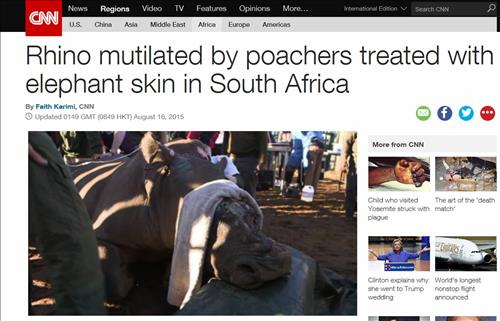 (서울=연합뉴스) 김남권 기자 = 남아프리카공화국의 한 코뿔소가 밀렵꾼에게 뿔을 빼앗기는 과정에서 난 상처 부위에 코끼리 피부를 접합하는 수술을 받았다고 CNN과 AFP통신 등이 15일(현지시간) 보도했다.