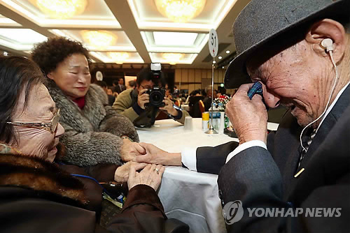 | △ <이산가족> '하염없이 눈물만' (금강산=연합뉴스) 이지은 기자 = 이산가족 상봉행사 2차 마지막날인 25일 오전 금강산면회소에서 열린 작별상봉에서 남측 상봉자 최고령자인 이오순(94.왼쪽)씨가 북측 동생 조원제(83)씨를 붙잡고 오열하고 있다. 2014.2.25 jieunlee@yna.co.kr |
