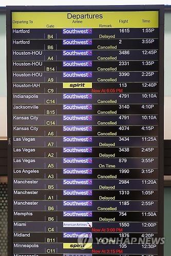 | △ 지난 15일 미국 메릴랜드 주 볼티모어 워싱턴 국제공항의 한 전광판에 대부분의 항공기가 결항 또는 지연됐음이 표시된 모습. |
