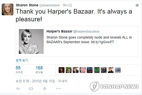 | △ 중풍 딛고 일어선 '원초적 본능' 샤론 스톤 (서울=연합뉴스) 중풍 때문에 힘겨운 시절을 보낸 뒤 최근 화려하게 부활한 미국 여배우 샤론 스톤이 투병 과정에서 변화한 일상을 솔직하게 털어놓았다. 스톤은 15일(현지시간) 월간 여성패션잡지 '하퍼스 바자'와의 인터뷰에서 "내 몸이 내출혈을 흡수하는 데 꼬박 2년이 걸렸다"며 "전체 DNA가 그 과정에서 모두 바뀐 것 같다"고 말했다. 사진은 샤론스톤이 자신의 인터뷰를 알린 트위터 홈페이지. 2015.8.16 << 트위터 캡처 >> hkmpooh@yna.co.kr |