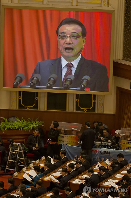 | △ 中 전인대 개막…경제성장 목표 7% (AP=연합뉴스) 5일(현지시간) 중국 베이징(北京) 인민대회당의 전국인민대표대회(전인대) 제12기 3차회의 개막식에서 리커창(李克强) 총리의 업무보고하는 모습이 장내 대형 화면에 비치고 있다. 리커창(李克强) 총리는 이날 보고에서 중국의 올해 경제성장 목표치를 7% 안팎이라고 밝혔다. 지난 2004년 7%로 설정한 이후 11년 만에 최저치로, 성장둔화가 특징인 뉴노멀'(New normal·신창타이<新常態>) 시대를 맞아 지난해 목표(7.5%)보다 낮춰졌다. bulls@yna.co.kr Chinese Premier Li Keqiang delivers the work report during the opening session of the National People's Congress at the Great Hall of the People in Beijing, Thursday, March 5, 2015. (AP Photo/Ng Han Guan) |