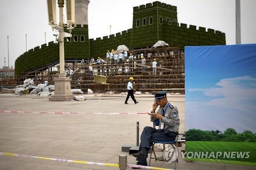 (베이징=연합뉴스) 진병태 특파원 = 내달 3일 항일전쟁 승리 70주년 기념 열병식을 앞두고 중국의 수도 베이징의 톈안먼(天安門) 광장에 '만리장성'이 모습을 드러냈다.