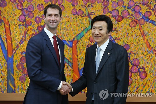 | △ 윤병세 장관, 톰 코튼 미 상원의원 접견 (서울=연합뉴스) 전수영 기자 = 윤병세 외교부 장관이 17일 오후 서울 도렴동 외교부에서 톰 코튼 미국 상원의원과 악수하고 있다. |