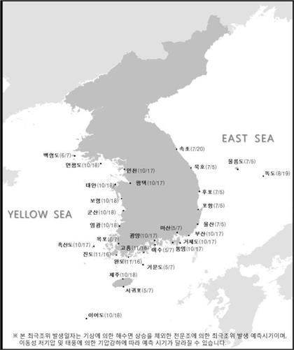 조석표에 따르면 인천, 군산, 부산, 통영, 제주 등 서·남해안 지역은 10월 17∼18일, 목포, 백령도 등은 6월 7∼8일, 여수, 마산, 서귀포 등은 5월 7∼8일의 해수면이 가장 높을 것으로 나타났다.