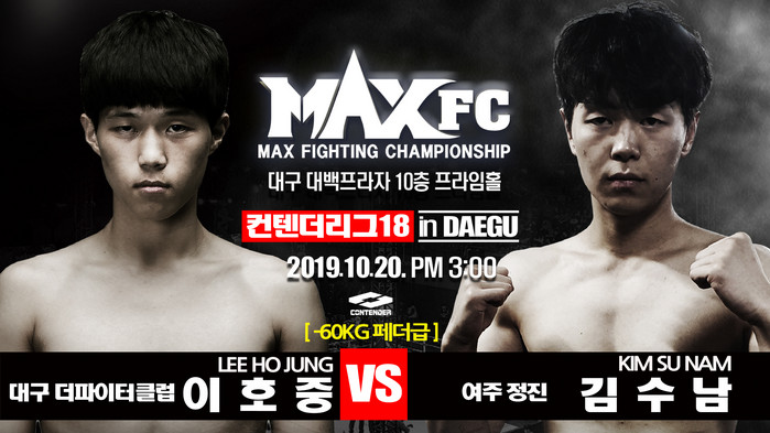[부자동네타임즈 김인수기자] MAX FC에서 경험을 쌓은 두 선수가 'MAX FC 컨텐더리그 18'에서 맞붙는다. 10월 20일 대구 대백프라자 10층 프라임홀에서 열리는 'MAX FC 컨텐더리그 18'에서 이호중(23, 더 파이터클럽)과 김수남(24, 여주 정진)이 페더급(60kg)으로 대결한다.