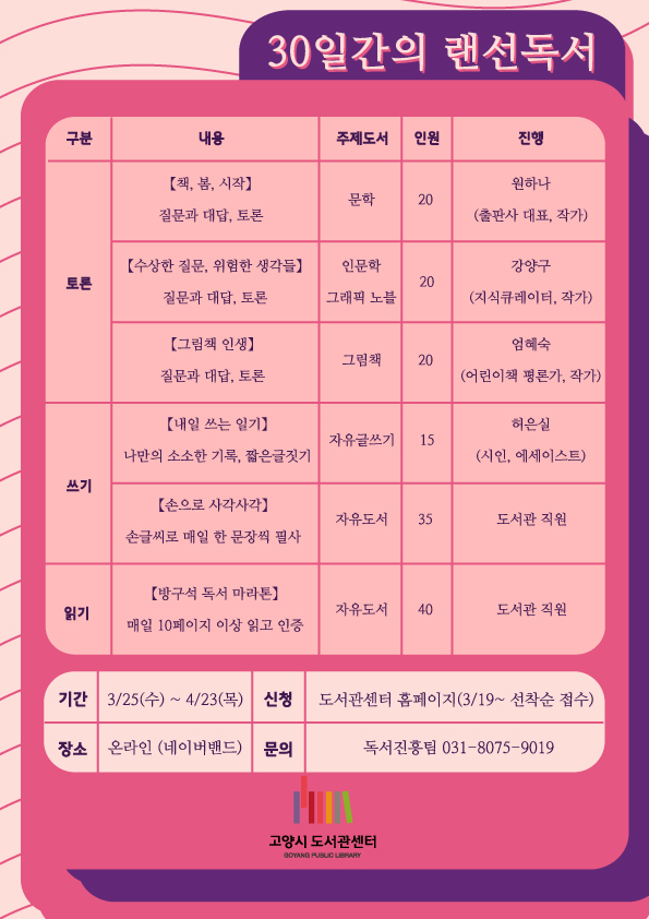 온라인 독서 프로그램 참여 신청은 3월 19일부터 고양시도서관 홈페이지(www.goyanglib.or.kr)에서 할 수 있으며, 자세한 사항은 홈페이지나 전화(☎031-8075-9019)로 문의하면 된다.