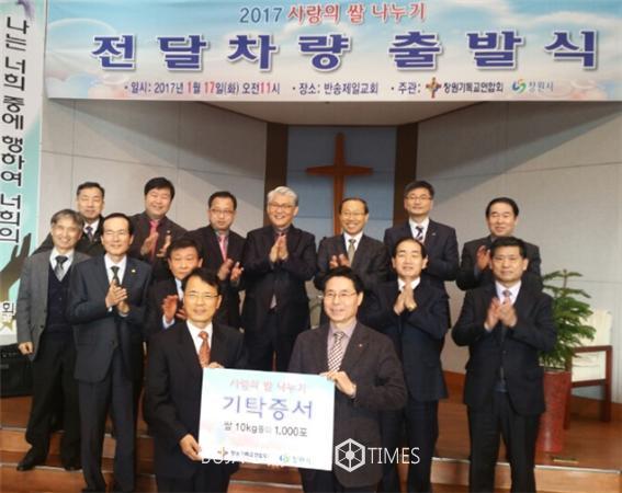 [부자동네타임즈 백수연 기자]창원기독교연합회(회장 이인덕 목사)는 민족고유 명절인 설날을 맞아 17일 반송제일교회에서 ‘사랑의 쌀 나누기운동’으로 모금된 쌀(10㎏들이) 1000포(1650만원 상당)를 창원시에 기탁했다.