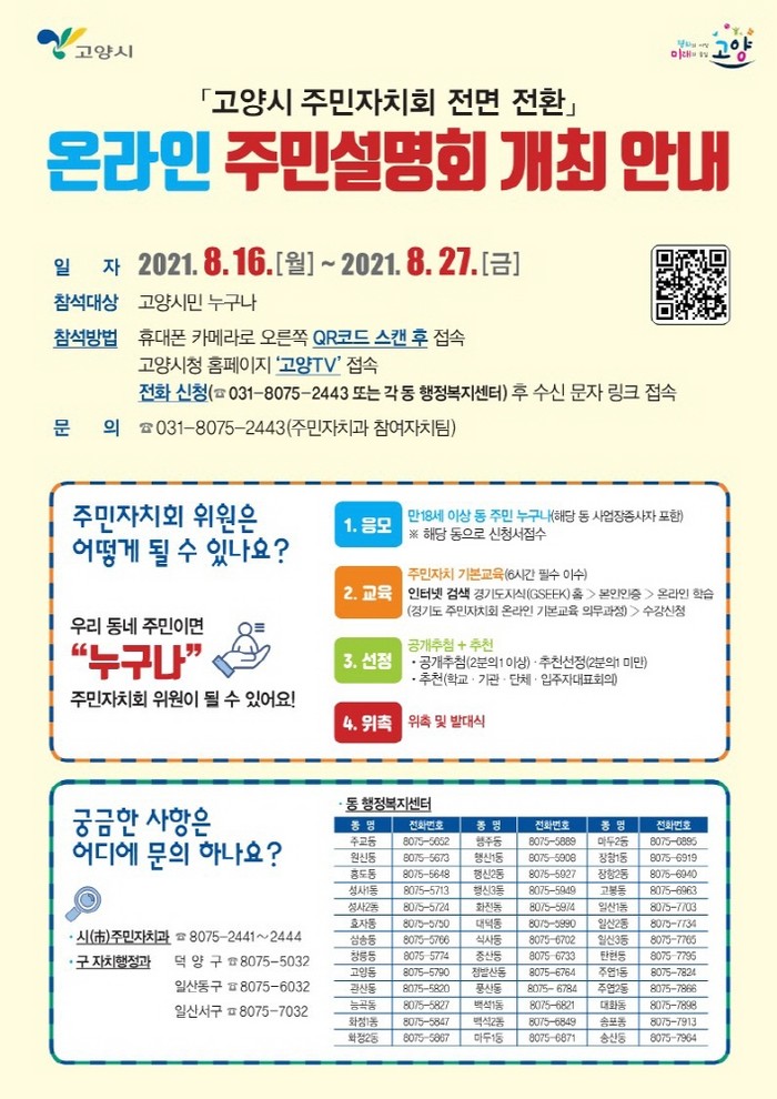 [부자동네타임즈 김인수기자] 고양시가 지난 8월16일부터 8월27일까지 고양시 유튜브 채널을 통해 ‘2021 고양형 주민자치 전면 전환 온라인 설명회’를 진행하고 있다.