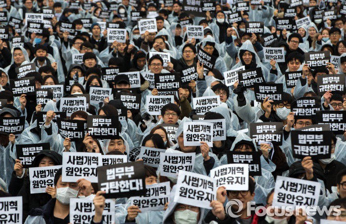 이번 소송은 오는 28일 서울행정법원 행정5부(부장판사 김경란) 심리로 첫 심문절차가 진행된다.전국 25개 로스쿨 재학생 6천여명이 지난 10일 오후 정부과천청사 앞 운동장에서 ‘전국 로스쿨생, 법무부 규탄 집회’를 하고 있다. 2015.12.10 성동훈 기자