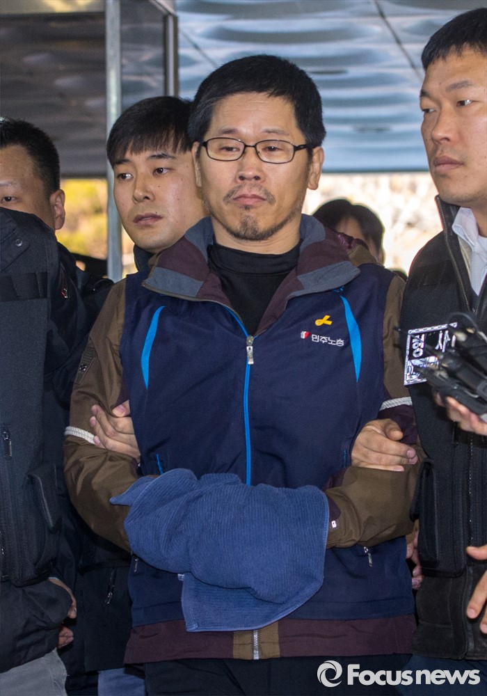 한편 한 위원장은 소요죄·일반교통방해·금지통고 집회 주최·금지장소 위반·해산명령 불응·집회자 준수사항 위반·특수공무집행방해·특수공무집행방해치상·특수공용물건손상 등 주로 집회와 관련된 불법행위에 대한 9개 혐의로 구속돼 검찰에 송치됐다.한상균 민주노총 위원장이 영장실질심사를 받기 위해 지난 12일 오후 서울중앙지방법원으로 들어서고 있다. 2015.12.12 강진형 기자