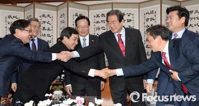 이어 "법사위원장에게 지금은 특수한 상황이니까 숙려기간 5일에 대해서는 좀 양해를 해달라고 부탁했다"면서 "아직 답은 듣지는 못했다"고 덧붙였다.24일 오후 서울 여의도 국회에서 정의화 국회의장과여야 대표, 원내대표, 정개특위 간사가 선거구 획정에 대한 담판을 위해만나, 악수하고 있다. 사진 왼쪽부터 새정치민주연합 김태년 정개특위 간사, 문재인 대표, 이종걸 원내대표, 정 의장, 새누리당 김무성 대표, 원유철 원내대표, 이학재 정개특위 간사. 2015.12.24 박철중 기자