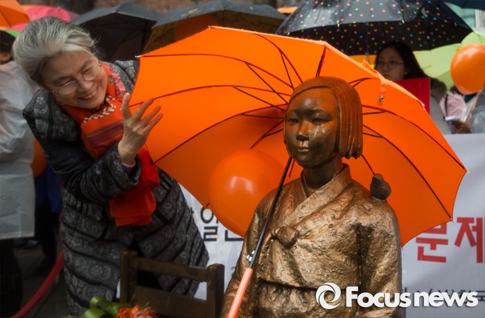 정식소송으로 넘어가면 일본이 서류 수령를 거부해도 당사자에게 서류 전달이 어려울 때 법원 게시판이나 관보, 신문 등에 게시해 전달된 것으로 인정하는 공시송달 제도로 판결선고가 가능해진다.지난 2일 오후 서울 종로구 옛 주한일본대사관 앞 '제1207차 일본군 위안부 문제해결을 위한 정기 수요시위' 집회에서 한 참석자가 소녀상에게 우산을 씌어주고 있다. 2015.12.02 김흥구 기자