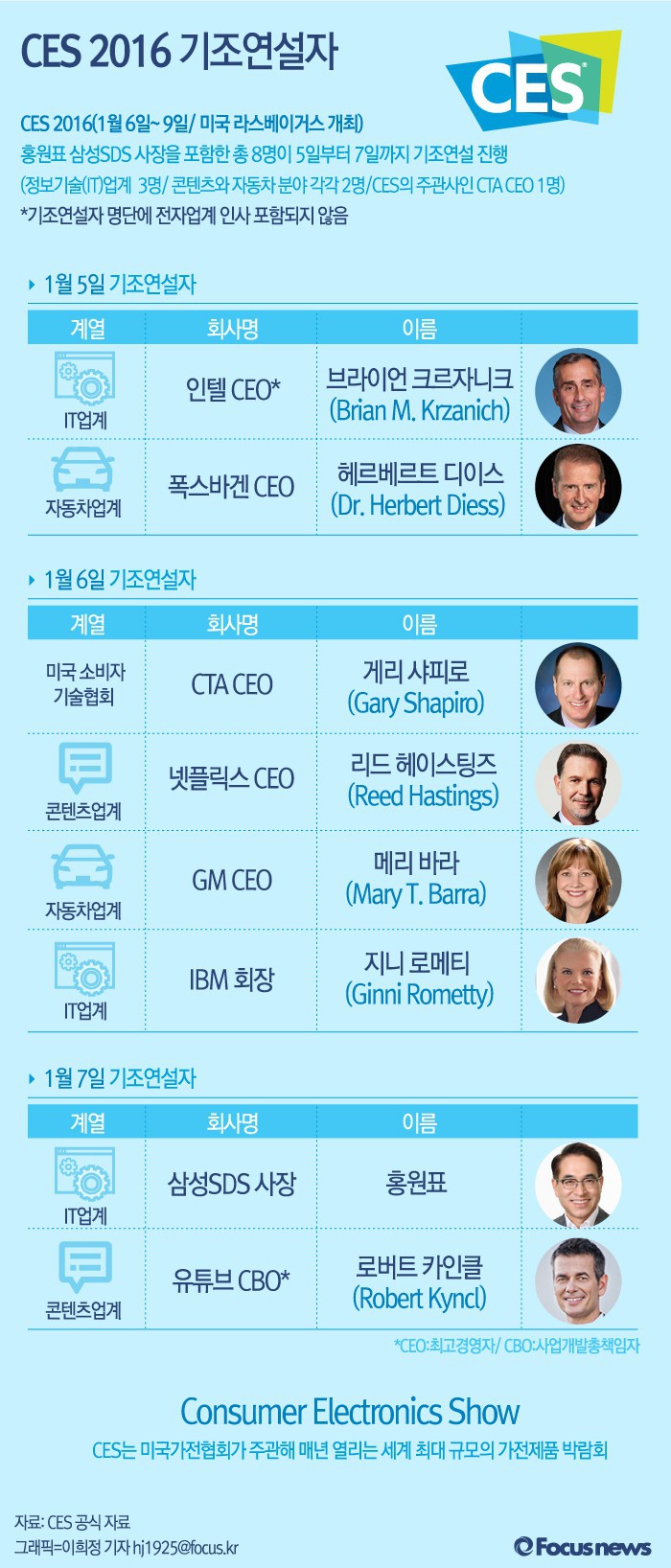 CES2016 기조연설자 8인 중 가장 많은 비중을 차지한 분야는 3명이 포함된 정보기술(IT)업계다. 콘텐츠와 자동차 분야가 그 뒤를 이어 각각 2명의 경영진이 기조연설을 진행한다. 나머지 한 명은 CES의 주관사인 CTA의 게리 샤피로(Gary Shapiro) 최고경영자(CEO)다.