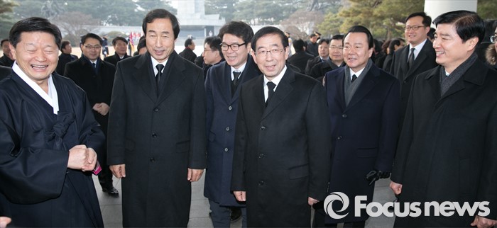 (서울=포커스뉴스) 병신년(丙申年) 새해 첫 날인 1일 오전 동작구 국립서울현충원에서 박원순 서울시장이 현충탑 참배를 마친 뒤 구청장들과 대화하고 있다.