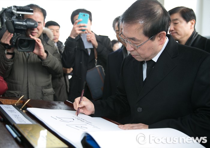 (서울=포커스뉴스) 병신년(丙申年) 새해 첫 날인 1일 오전 동작구 국립서울현충원에서 박원순 서울시장이 현충탑 참배를 마친 뒤 방명록을 작성하고 있다.