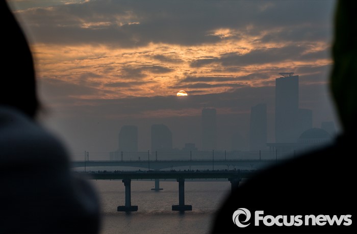 (서울=포커스뉴스) 2016 병신년(丙申年) 첫날인 1일 아침 서울 영등포구 선유도에서 빌딩숲 사이로 떠오르는 첫 해를 사람들이 바라보고 있다.