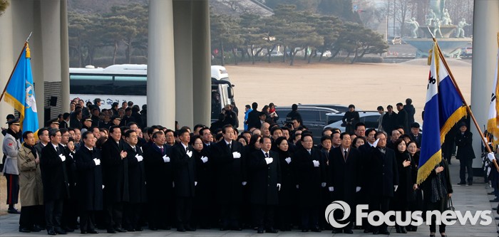 (서울=포커스뉴스) 병신년(丙申年) 새해 첫 날인 1일 오전 동작구 국립서울현충원에서 김무성 새누리당 대표 등 의원들이 현충탑 참배를 위해 이동하고 있다.