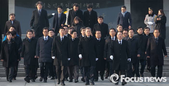 (서울=포커스뉴스) 병신년(丙申年) 새해 첫 날인 1일 오전 동작구 국립서울현충원에서 문재인 더불어민주당 대표 등 의원들이 현충탑 참배를 마친 뒤 이동하고 있다.
