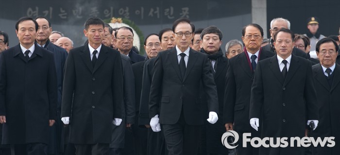 (서울=포커스뉴스) 병신년(丙申年) 새해 첫 날인 1일 오전 동작구 국립서울현충원에서 이명박 전 대통령이 현충탑 참배를 마친 뒤 나서고 있다.